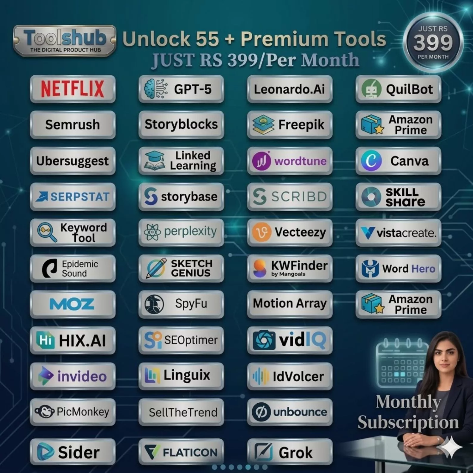 Why pay thousands every month when you can unlock everything you need in one bundle? Get instant access to SEMrush, Netflix, Amazon prime, Moz Pro, Ubersuggest, KeywordTool.io, SpyFu, Screaming Frog, Grammarly Premium, QuillBot, Jasper AI, Rytr, WordHero, ChatGPT Plus, Canva Pro, Envato Elements, Placeit, and InVideo—all for just ₹599.